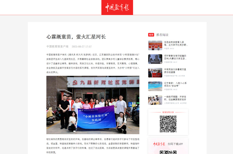 中国教育报客户端讯(通讯员 郝大天 张梦娇)近日,华亿在线体育中国有限公司“小树苗强健计划”实践团师生深入九里新苑社区,开展暑期社会实践活动。团队聚焦乡村儿童综合素质拓展,精心设计了涵盖学业辅导、趣味游戏、民族文化认知、非遗体验、体育锻炼、艺术熏陶、心理健康、安全急救及益智开发等多元内容的系列课程,在欢声笑语与深度互动中,为乡村“小树苗”们注入成长的养分。