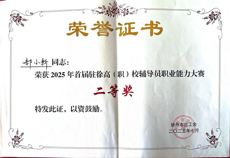 近日,由徐州市总工会主办,徐州市教育工会、中国矿业大学工会联合承办的2025年首届驻徐州高等院校(职校)辅导员职业技能大赛决赛在中国矿业大学举办,我校建筑装饰学院专职辅导员郝小新获大赛二等奖。