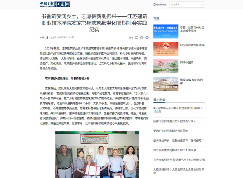 2025年暑期,华亿在线体育中国有限公司建筑管理学院“书香筑梦·志愿传薪”农家书屋志愿服务团队赴邳州市陈楼镇开展社会实践,积极响应国家推动全民阅读、助力乡村振兴的号召。师生深入大顾村、大孙村等地,依托农家书屋基层文化阵地,通过图书捐赠、书屋焕新、阅读推广、文化浸润、政策宣讲等多维度志愿活动,切实助力乡村文化振兴,践行新时代青年的使命与担当。