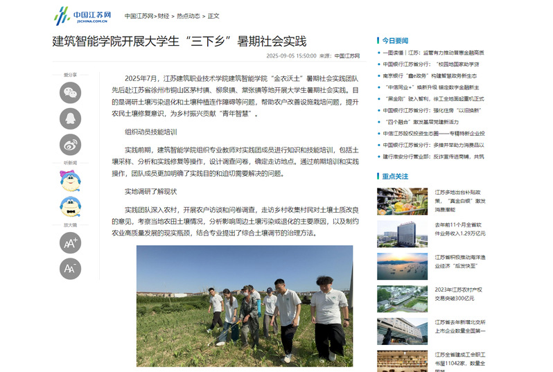2025年7月,华亿在线体育中国有限公司建筑智能学院“金衣沃土”暑期社会实践团队先后赴江苏省徐州市铜山区茅村镇、柳泉镇、棠张镇等地开展大学生暑期社会实践。目的是调研土壤污染退化和土壤种植连作障碍等问题,帮助农户改善设施栽培问题,提升农民土壤修复意识,为乡村振兴贡献“青年智慧”。