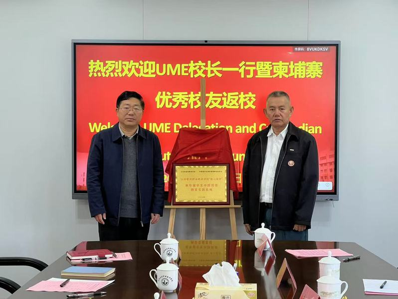会后,双方举行了“建心筑梦”来华留学生中国国情教育实践基地揭牌仪式,以及马德望应用技术学院教育装备资源捐赠仪式。