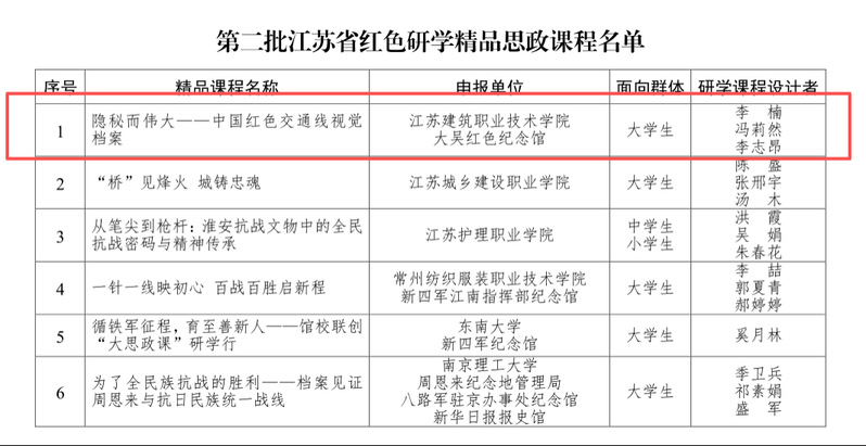 近日,由江苏省文化和旅游厅、省教育厅、新华日报社联合主办的第二批江苏省红色研学精品思政课程遴选结果揭晓,我校马克思主义学院的思政研学课程《隐秘而伟大——中国红色交通线视觉档案》《抗战堡垒 文明新村——湖西抗日根据地的信仰答卷》入选,我校也是此次唯一一所入选两门课程的高校。