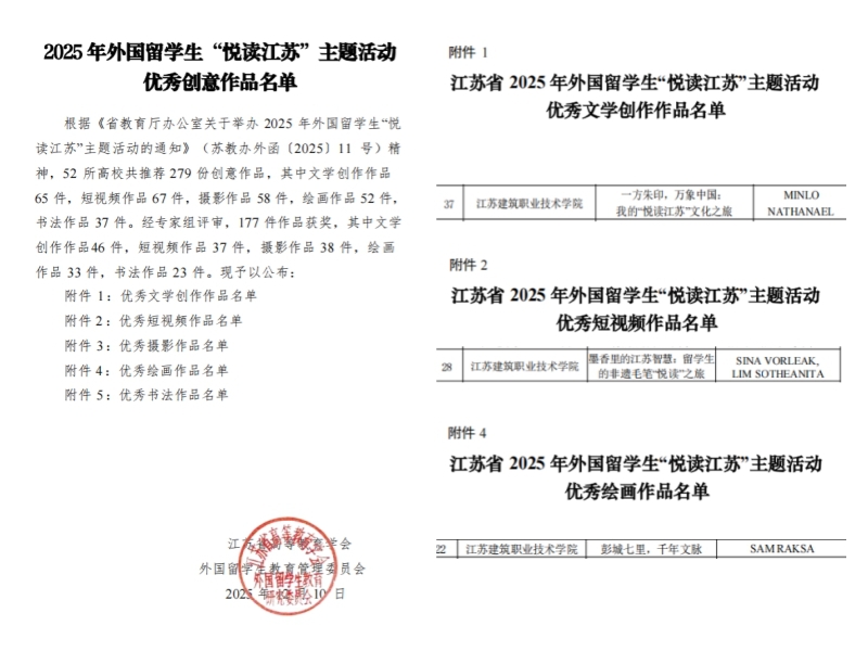 近日,江苏省高等教育学会外国留学生教育管理委员会公布了2025年外国留学生“悦读江苏”主题活动优秀创意作品评选结果,我校喀麦隆留学生米罗(MINLO NATHANAEL)的作品《一方朱印,万象中国:我的“悦读江苏”文化之旅》(指导老师:张雨婷)入选优秀文学创作作品名单;柬埔寨留学生罗彬辰(SAM RAKSA)的作品《彭城七里,千年文脉》(指导老师:于梅)入选优秀绘画作品名单;柬埔寨留学生易美珠(SINA VORLEAK)、林妮达(LIM SOTHEANITA)的作品《墨香里的江苏智慧:留学生的非遗毛笔“悦读”之旅》(指导老师:龚翠玲、杜春梅)入选优秀短视频作品名单。同时,我校柬埔寨留学生蔡清琳(CHHUON CHHENGLIN)在2025年“我是说‘苏’人”年度人物推荐活动中获“学术之星”提名奖。