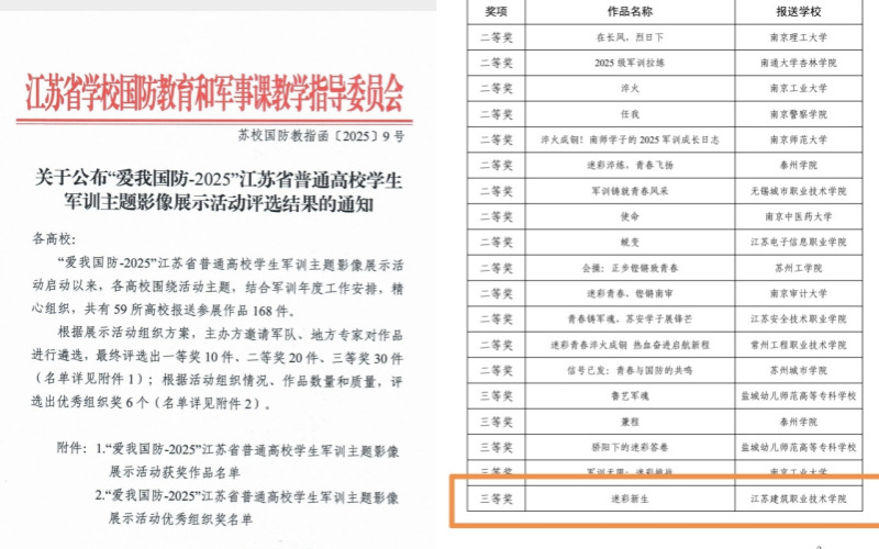 同期,在省学校国防教育和军事课教学指导委员会主办的“爱我国防-2025”军训主题影像展示活动中,我校报送的作品《迷彩新生》获省级三等奖。